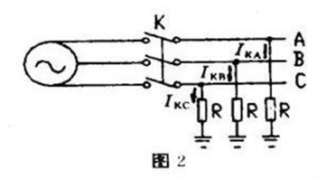 同理,如只在工作的兩相上裝接地線,如圖4所示。當開關K誤投入時,相當于兩相短路接地。在大電流接地系統,將有相當大的短路電流在接地電阻R上產生很高的壓降,所以極為危險;在小電流接地系統,也將有單相短路接地時電容電流的一半從接地電阻R上流過,并產生一定的壓降,因而也是不安全的。